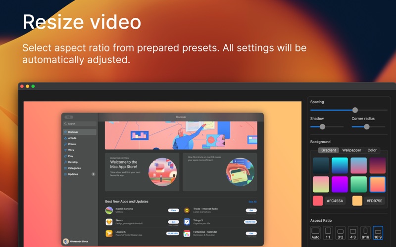 自我介绍Gifmate:您的终极屏幕录制和视频创建工具 Gifmate是您在Mac上捕捉高质量视频,制作屏幕录制和创建令人惊叹的内容的一站式解决方案。无论您需要录制整个屏幕、特定区域还是单个应用程序窗口,Gifmate都提供了您需要轻松捕捉和制作视频的工具。 **主要功能:** **精确捕获您的Mac工作区** - 录制整个Mac屏幕甚至是外部显示器。 - 选择屏幕的特定区域以专注于重要细节。 - 隔离单个应用程序窗口,用于深入的教程或演示。 **轻松提升您的录制** - 使用我们直观的功能将您的录制精雕细琢。 - 添加填充并调整输出尺寸以匹配内容的要求。 - 通过圆角和添加阴影,使您的视频具有专业触感。 - 自定义背景以创建引人注目的视觉体验。 **通过自定义快捷方式提高工作效率** - 使用个性化的快捷键组合完全控制您的录制过程。 - 使用键盘快捷键快速选择您喜欢的录制源。 - 无缝切换不同的选择模式以获取多样的录制选项。 - 轻松启动和停止录制会话,节省时间和精力。 **为什么选择Gifmate?** - 一个应用程序内轻松进行屏幕录制和视频制作。 - 为培训、演示或娱乐创建高质量视频。 - 使用用户友好的界面个性化您的内容,包括自定义编辑和快捷方式功能。 - 提高工作效率,提供友好的用户体验。 捕捉、创作并与世界分享您的想法 - 立即下载Gifmate,体验终极屏幕录制器和视频创作者。通过Gifmate,将每个视频项目变成杰作! 1. Custom Color Selection and Gradient Creationю. You can now select your preferred colors and even create your own unique gradients. 2. Enhanced Localization Support. Gifmate now speaks your language, including French, Spanish, German.