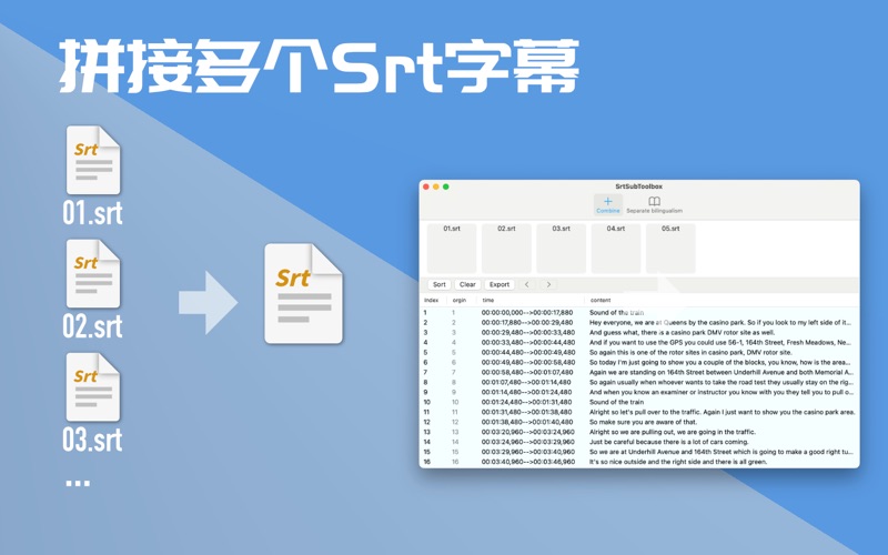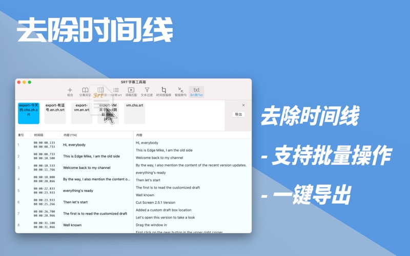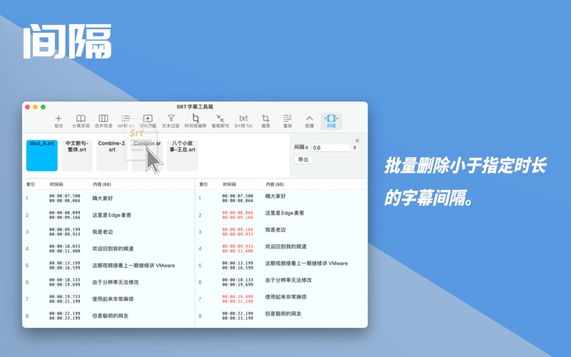 SRT字幕工具箱 是一款功能强大的 macOS 应用程序,专为处理 SubRip(SRT) 字幕文件而设计。 这款应用完全离线运行,确保您的数据始终保存在本地设备中,不依赖云存储或网络连接。我们注重用户隐私,所有操作和数据处理都在您的设备上完成,避免任何信息泄露的风险,您的隐私和安全将始终得到最严格的保障。 主要功能介绍: 1. 多段 SRT 文件拼接: "SRT 工具箱" 提供了一个简单而强大的拼接功能,允许您将多个 SRT 文件合并为一个文件。您只需选择要合并的 SRT 文件,应用程序会自动将它们按照时间顺序合并,创建一个全新的 SRT 文件。这有助于整理和编辑多个片段的字幕,使得字幕文件更加整洁和方便。 2. 双语 SRT 文件分离: 如果您需要为双语字幕创建 SRT 文件,"SRT 工具箱" 提供了一个简便的方式来处理。您可以直接拖入一个双语的SRT字幕文件,然后应用程序会自动分离成两个包含两种语言的双语 SRT 文件。这对于多语言视频内容的字幕制作非常有用。 3.乱码处理: 有时候在Windows上处理的GBK编辑的SRT文件,在导入Mac后会显示乱码,只要通过导入此工具,再另存一次就可以正常使用了。 4. 合成双语字幕: 你有一份英文的,一份中文的SRT字幕文件,想把它们合成一份中英文的双语字幕,那就请使用这个功能吧。 5. Txt转SRT / SRT转Txt: 把Txt转成SRT文件,这样直接可以导入视频编辑软件,不用再手动一个个复制粘贴进去了。 将SRT转换为txt文件。(删除时间线) 6. 译文匹配: 适合广大字幕工作者在拿到翻译稿后,快速给翻译稿匹配上时间码。节省大家宝贵的工作时间。 7. 文本过滤: 直接过滤出自己需要的文本内容。 - 中文:过滤出包含中文的内容,以行为单位,自动过滤掉空行。 - 英文:过滤出包含英文的内容,以行为单位,自动过滤掉空行。 - 中文+相反,过滤出不包含中文字符的行。 - 英文+相反,过滤出不包含英文字符的行。 8.时间线偏移 - 往前调节时间线 - 往后调节时间线 9. 智能断句 - 处理Whisper转换出来的字幕 - 支持英文/中文 10. Srt转Txt (去时间线) - 去除SRT字幕时间线,把其转化为Txt 11. 裁剪 - 留下指定时间线内的字幕 12. 重排 - 按指定最大字符数,切割每条字幕。 - 支持中文/英文字幕 - 支持“去重”,删除相邻重复的字幕。 - 删除回车,使多行字幕变成一行。 13. 前缀 - 支持批量给字幕加前缀/后缀 14. 间隔 - 去除指定值内的字幕间隔 - 支持批量操作 "SRT字幕工具箱" 是一个面向字幕编辑人员、内容创作者和多语言视频制作人员的工具,可以极大地提高字幕编辑的效率和质量。无论是处理多段字幕还是分离双语字幕,这款应用程序都能够满足您的需求。 v2.3.9 1. 优化“搜索”。 比如二行的字幕中间插入一个空白行,替换方案就如下: " -> "