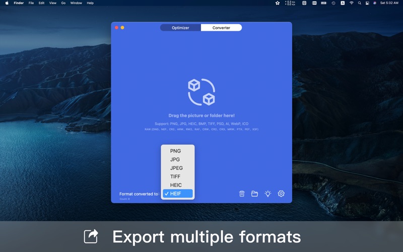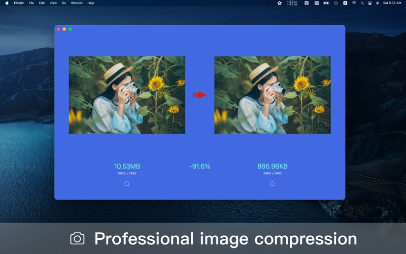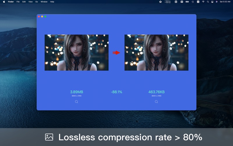 【简介】 Hello 是一款功能强大的图片处理软件,主要包含图片压缩和图片格式转换。提供了PNG和JPG图片的"无损"压缩服务,文件大小减少60%-90%。经过压缩的图片可能只有原来的1/8的大小,但是质量却完美无瑕。也支持20多种图片格式转换为常见的格式。 使用Hello,你可以通过简单的拖拽完成对PNG/JPG图片的压缩,无需打开浏览器,无需手动下载图片。您只需要一个动作完成整个服务,更便利... 【功能】 1. 支持PNG/JPG图片图片文件压缩 2. 支持拖拽整个文件夹,自动识别所有图片 3. 支持批量压缩 4. 支持压缩后自动替换原图 5. 支持全天24小时自动压缩,一天能压缩约72000张图片 6. 支持图片格式批量转换为PNG、JPG、HEIC、TIFF 【图片格式支持】 PNG, JPG, HEIC, BMP, TIFF, PSD, AI, ICON, WebP RAW格式:DNG、NEF、CR2、ARW、RW2、RAF、CRW、CR2、CR3、MRW、PTX、PEF、X3F等等。 【谁适合使用】 UI设计师、平面设计师、客户端/前端开发工程师必备!编辑、摄影师、网店、个人博客… 一切完美主义注重细节品质的创作者。 【愿景】 Hello愿和完美主义者做好每一个细节,提供业内第一水平的服务,以最高的标准做一款简单好用的软件。 【联系方式】 您有任何问题,可通过如下方式联系我 Email:rosesummersky@gmail.com 【订阅说明】 1. 订阅周期:1个月 2. 订阅价格:$0.99/月(美国地区适用) --- 不同地区的价格可能有所不同。费用将从 iTunes 帐户绑定的信用卡中扣取,付费帐户到期后将自动续订。如需取消续订,可以在当前付费周期结束前24小时进行操作。付费帐户激活后,将无法取消。购买后,可以在帐户设置中管理续订。 --- 隐私策略 https://iluoxiao.gitbook.io/hello/about/privacy 服务条款 https://iluoxiao.gitbook.io/hello/about/terms 1.新增5种转换格式 2.提升软件兼容性